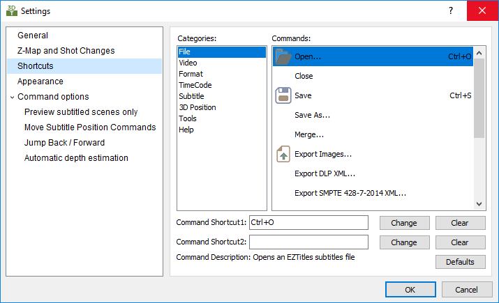 Pressing the Defaults button will restore the shortcut combinations to the default ones used in 3DTitles.