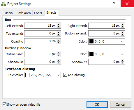 Opacity option is applied for Ghost boxed, Ghost striped and Ghost block-boxed subtitles. Larger values make the box less transparent. The default is '35%'.