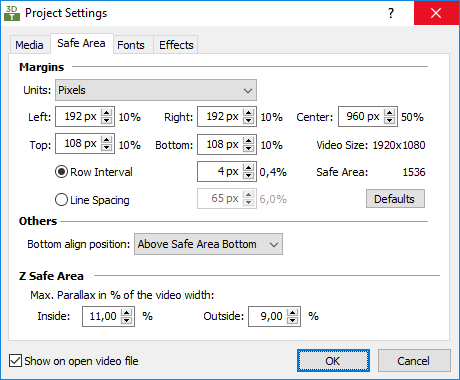If you have such limits defined by your customer you can apply them here. The program won’t allow you to add depth to the subtitle if its value falls beyond these restrictions. The parallax is measured as a percent (ratio) of the screen's width. The default values provide comfort and they are high enough so you should not fee restricted by them in any way.