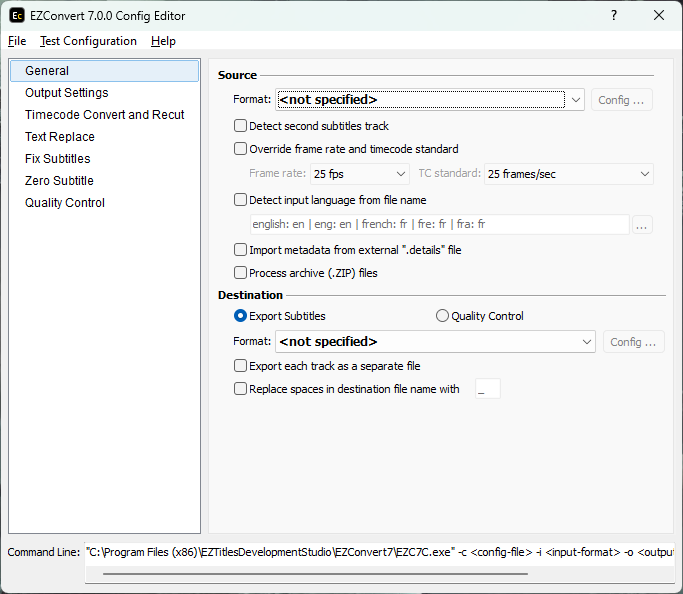 "C:\Program Files (x86)\EZTitlesDevelopmentStudio\EZConvert7\EZC7C.exe" -c "C:\TEST\config.cfg" -i SRT -o TT <input-file> <output-file>