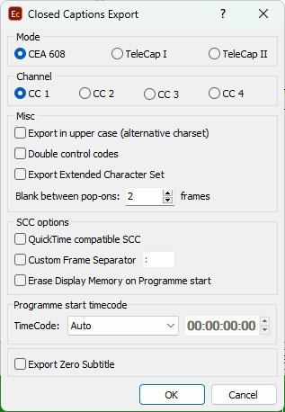 Enables insertion of Erase Display Memory (EDM) control code at the selected Programme Start Timecode(see below). This may be needed by certain equipment and applications, like QuickTime, to correctly keep Closed Captions data in sync with the video playback. |