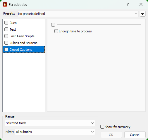 << Click to Display Table of Contents >> Navigation: Quality Control > Fix Subtitles > Closed Captions category |