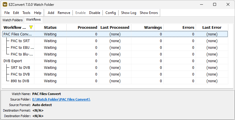 As you can see from the screenshot above there are two Workflows defined: "DVB Export" and "PAC Files Convert". Below the workflows are listed the Watch Folders they incorporate.