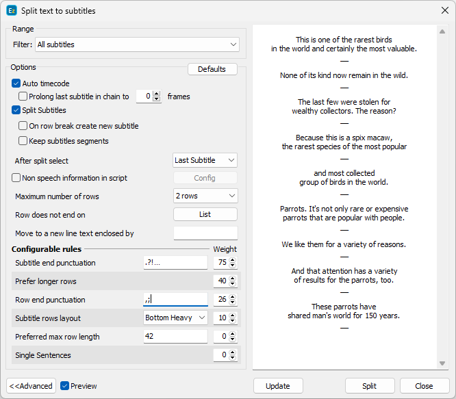 The Preview checkbox opens the preview panel (the right part of the above image) showing how the text would look like after executing the Split... command with the current configuration. Modifying the rules or changing their weight to the algorithm will not simultaneously update text's preview. It will be updated only after pressing the Update button.