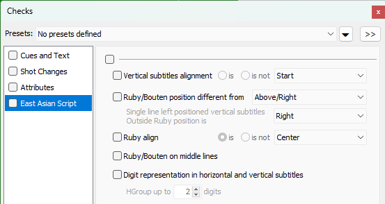 This option allows you to check if the ruby/bouten characters in one-line vertical subtitle positioned to the left appear Left or Right from the base text. The option can be used only if Ruby/Bouten position different from is set to Outside.