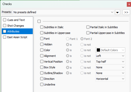 << Click to Display Table of Contents >> Navigation: Quality Control > Check Subtitles > Attributes category |