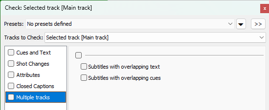 << Click to Display Table of Contents >> Navigation: Quality Control > Check Subtitles > Multiple Tracks category |