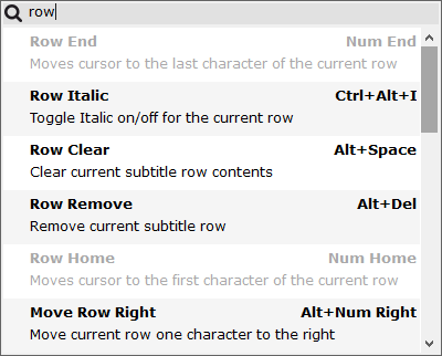 Some of the commands, like Row End on the above image, may appear grayed out. Grayed out commands cannot be executed at the moment because they could be either disabled in the current Mode (Teletext, Closed Captions, etc), or they don't apply to the selected from the GUI element. For example, Row End can be executed only if subtitle in the main editor is selected. Trying to invoke Row End when the preview list or timeline are on focus will not do anything.