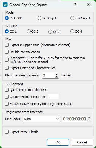 Enables insertion of Erase Display Memory (EDM) control code at the selected Programme Start Timecode(see below). This may be needed by certain equipment and applications, like QuickTime, to correctly keep Closed Captions data in sync with the video playback. |