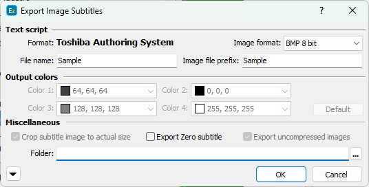<< Click to Display Table of Contents >> Navigation: Export Subtitles > Image Export Formats > Toshiba Authoring System |