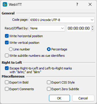 Allows you to Recut/Offset the subtitles during the export. This may be required for subtitle projects that do not start from 00:00:00:00, they are offset by an hour or more. Most video players assume the video always plays from 00:00:00:00 which creates synch issues with subtitles that are offset. From the drop-down menu you can choose between the following options: None - doesn't recut or offset the subtitles and they will be exported with their original timing. Manual - allows you manually specify the offset for the recut. Auto - automatically offsets the timing using the first subtitle's In-cue. All timecodes are offset backward with the first subtitle's In-cue rounded down to the closes hour. For example if the first subtitle originally starts at 10:00:32:21 after applying the recut it's start time will become 00:00:32:21. Programme Start TC - automatically subtracts the value of the Programme Start TimeCode parameter saved in the Details. Programme Start TC can be selected from Video/Setup Timecode with a video opened in. Video Start TC - automatically gets video's start time as specified in Video/Setup Timecode. This option can be used only when a video is loaded in. |