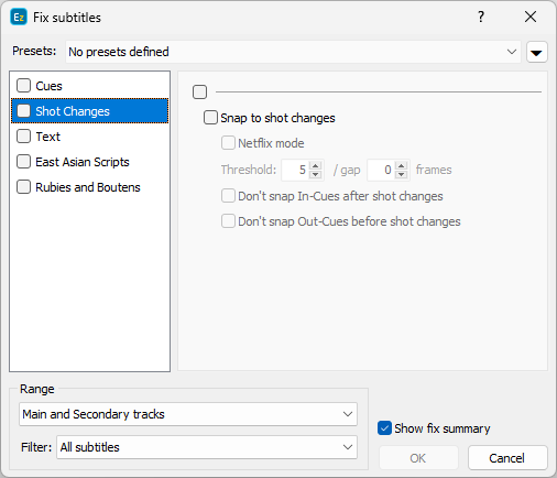 By using this option, only the In-cues inserted before a shot change within the threshold/gap interval will be fixed and respectively snapped. It can be used to fulfill specific client requirements, that need only the subtitles crossing a shot change to be snapped to it. |
