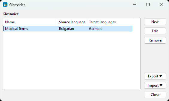 Next, double-click the cell under the source language, type in the term, and press Tab or double-click the corresponding cell under the target language to type in the translation. To remove an entry from the glossary, select the respective row and click Remove.