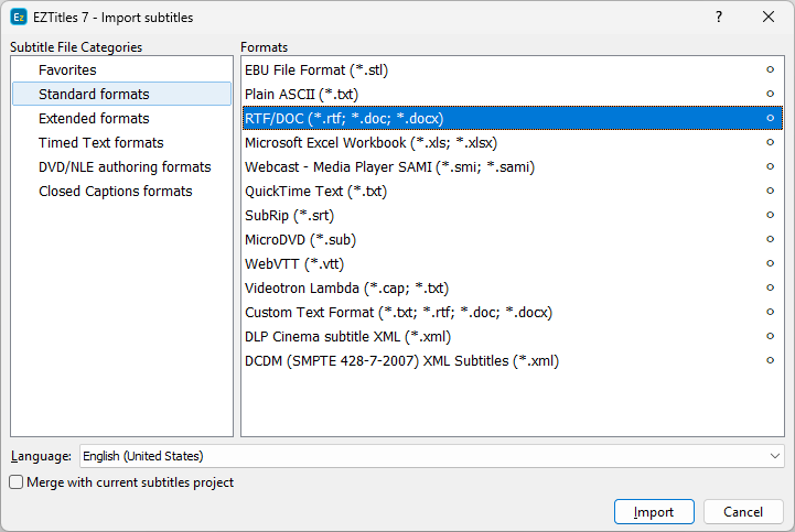 In addition to using the quick import you may as well use the Advanced Import one from the Import/Export drop-down menu. It enlists all supported by EZTitles subtitle formats divided into subcategories. If there are any formats not included in the EZTitles license edition that you've ordered they will be grayed out.