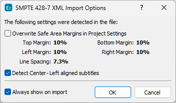 When loading subtitles from DLP Cinema XML file, EZTitles will analyze the contents of the file in an attempt to detect what Safe Area settings shall be used for the most compliant preview of the XML file and keeping the positioning as closest to the original as possible. Text's vertical/horizontal position on the screen depends on the Line Spacing, Horizontal (Left) and Vertical (Bottom) margins.