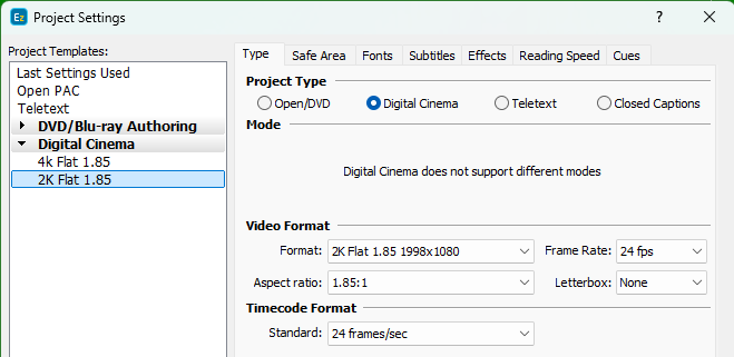 << Click to Display Table of Contents >> Navigation: Running and Configuring EZTitles > Configuring Project Settings > Project Settings > Project Type and Mode > Digital Cinema Projects |