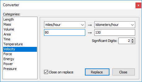 When Close on replace option is clicked, the Unit Converter will be automatically closed after pressing the Replace button. Otherwise it will remain open with the editor on focus.