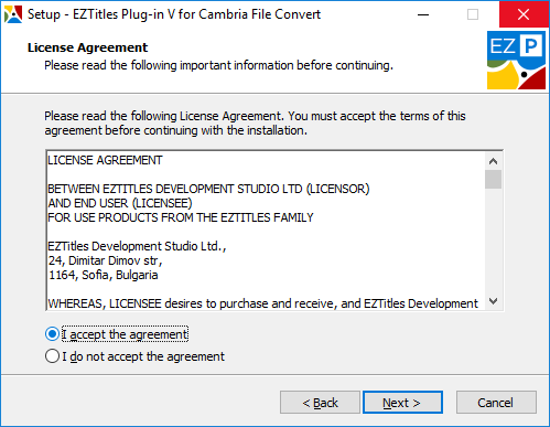 Installing the EZTitles Plug-in for Cambria is a straight forward process. You just have to click on the Wizard's Next button, like any other Windows compliant application, until you have fulfilled all the instructions.