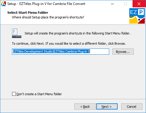 The next dialog will ask you to specify a Start Menu folder for Plug-in's shortcuts and Help files will be placed. You may also choose to skip the folder creation by checking the Don’t create a Start Menu folder checkbox.