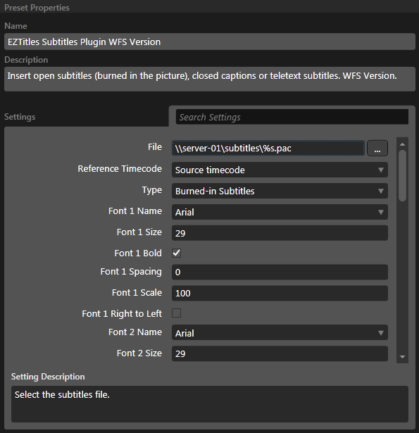 Specify the subtitles files name, extension and location. Both the %f and %s wildcard options can be used, for example "%f\%s.pac". The "%s" wildcard attribute can be used to distinguish if the subtitles need to be encoded for the leading, trailing clips or only for the main video. "%s1" is replaced with the first file's name, which is usually the leading clip; "%s2" stands for the second file's name, usually the main clip; "%s3"- with the third file's name which is usually the trailing one. The same applies for the "%f" wildcard attribute as well. Please note that "%s" and "%f" are also available and are equivalent to "%s1" and "%f1". Another useful wildcard is %f which matches the source video folder. It is important to mention that %f does not include a trailing \ character. The * and ? characters can also be used: the asterisk * matches any sequence or number of characters while the question mark ? matches any single character. Note: It is important to always enter the subtitle's file extension in these patterns instead of using wildcard characters ( .* or .???). Otherwise, the Plug-in will try to load in the first file which matches the pattern in this folder and respectively result into an error if it doesn't support its format. |